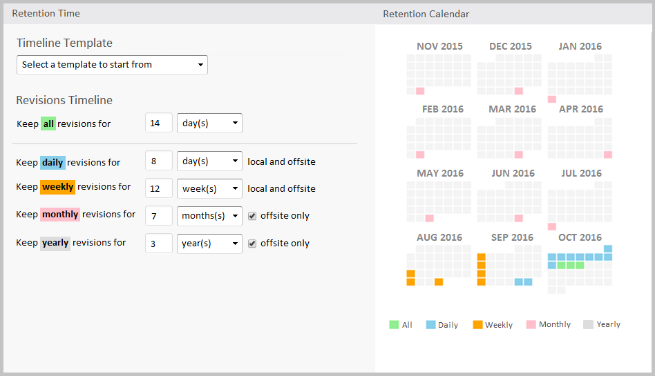 Pode definir o período de tempo para reter backups no armazenamento local, no armazenamento externo ou em ambos, para um equilíbrio perfeito entre proteção de dados e requisitos de armazenamento.