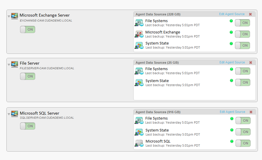 Proteja todos os seus ambientes, incluindo servidores de ficheiros, servidores virtuais (VM e Hyper-V), bases de dados SQL, Microsoft Exchange e até mesmo o Office 365.