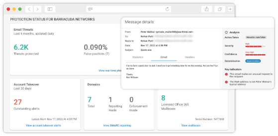 A Barracuda utiliza AI comportamental para monitorizar padrões internos de Email e anomalias de início de sessão, detetando contas comprometidas e removendo automaticamente mensagens maliciosas.